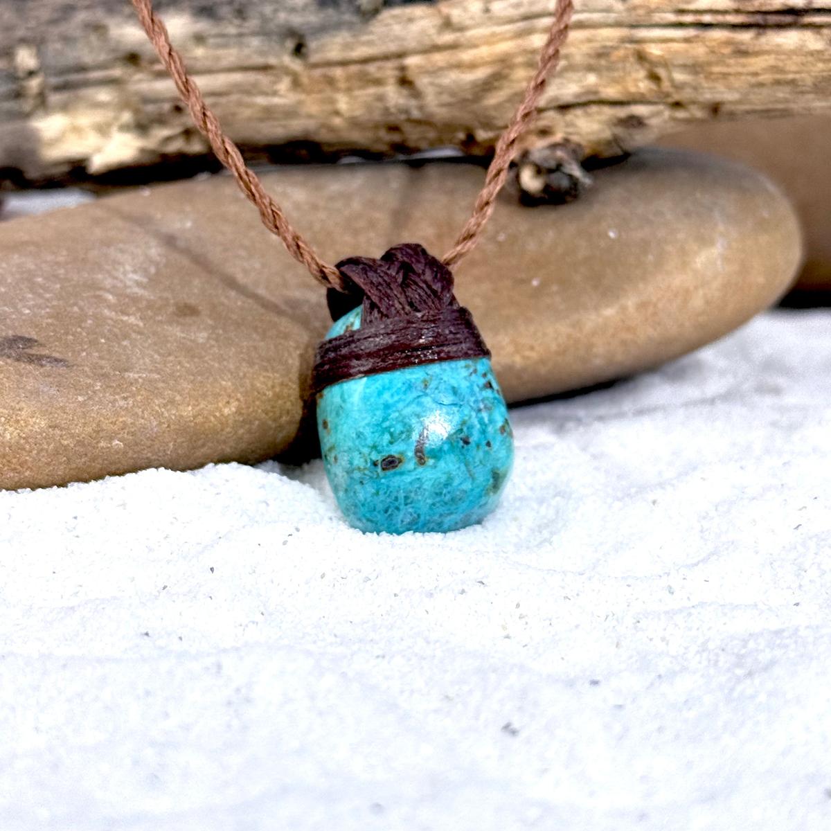 Beautiful assorted tumbled stone pendants, bound with, and hanging from, adjustable length leather cord necklaces.