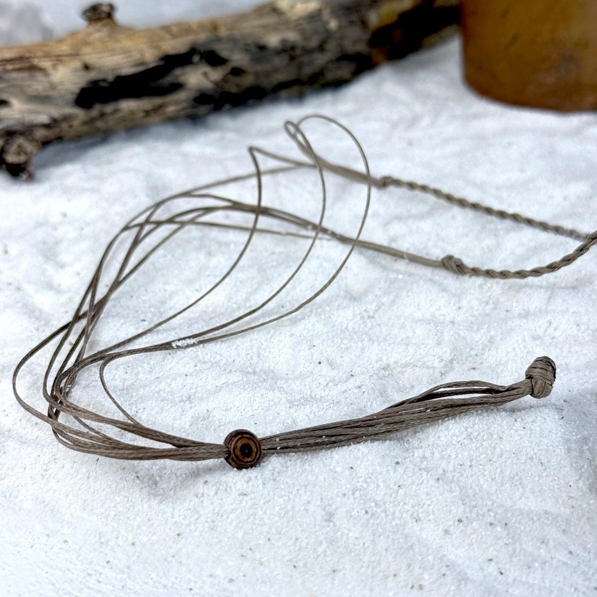 The necklaces are created using a strong leather stitching cord, and the crystals are set in a specialised adhesive that forms an unbreakable bond. The necklace part is waxed which will wear away in time. It helps lock the wooden bead that holds the pendant at the desired length- as they're adjustable in length. If the bead starts slipping as the wax wears away, you can either tie a simple overhand knot behind the bead (which comes undone remarkably easily) or re-wax your necklace with beeswax.