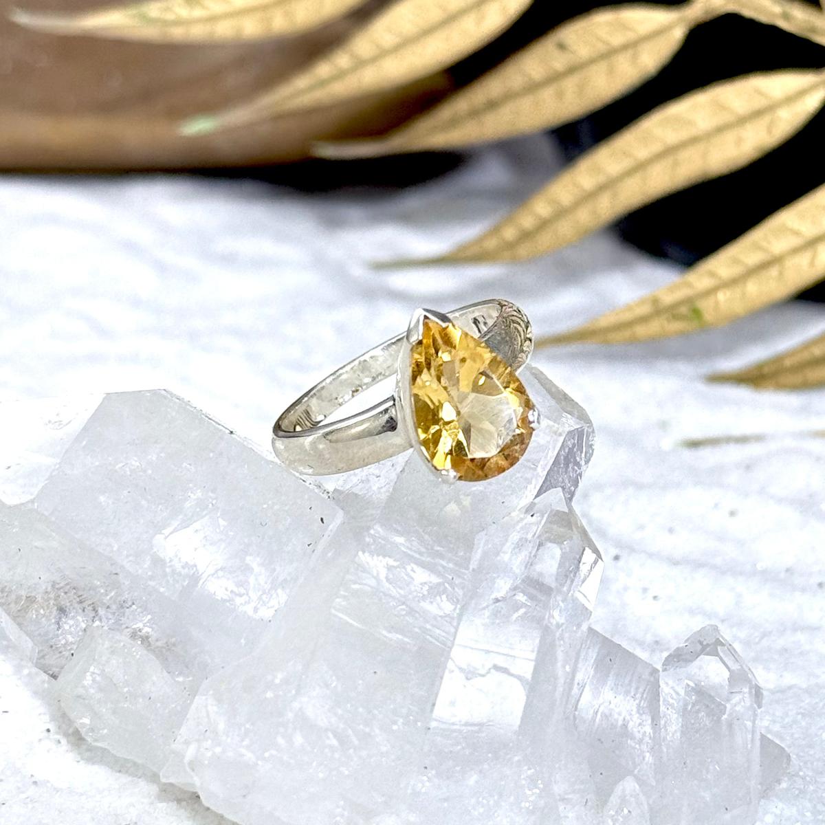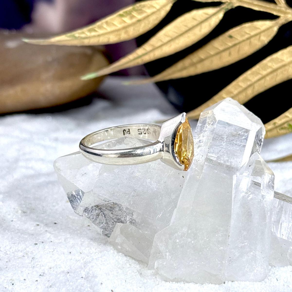 A stunning, teardrop cut, Citrine gemstone, claw set in a Sterling Silver ring band. Size: 9/S