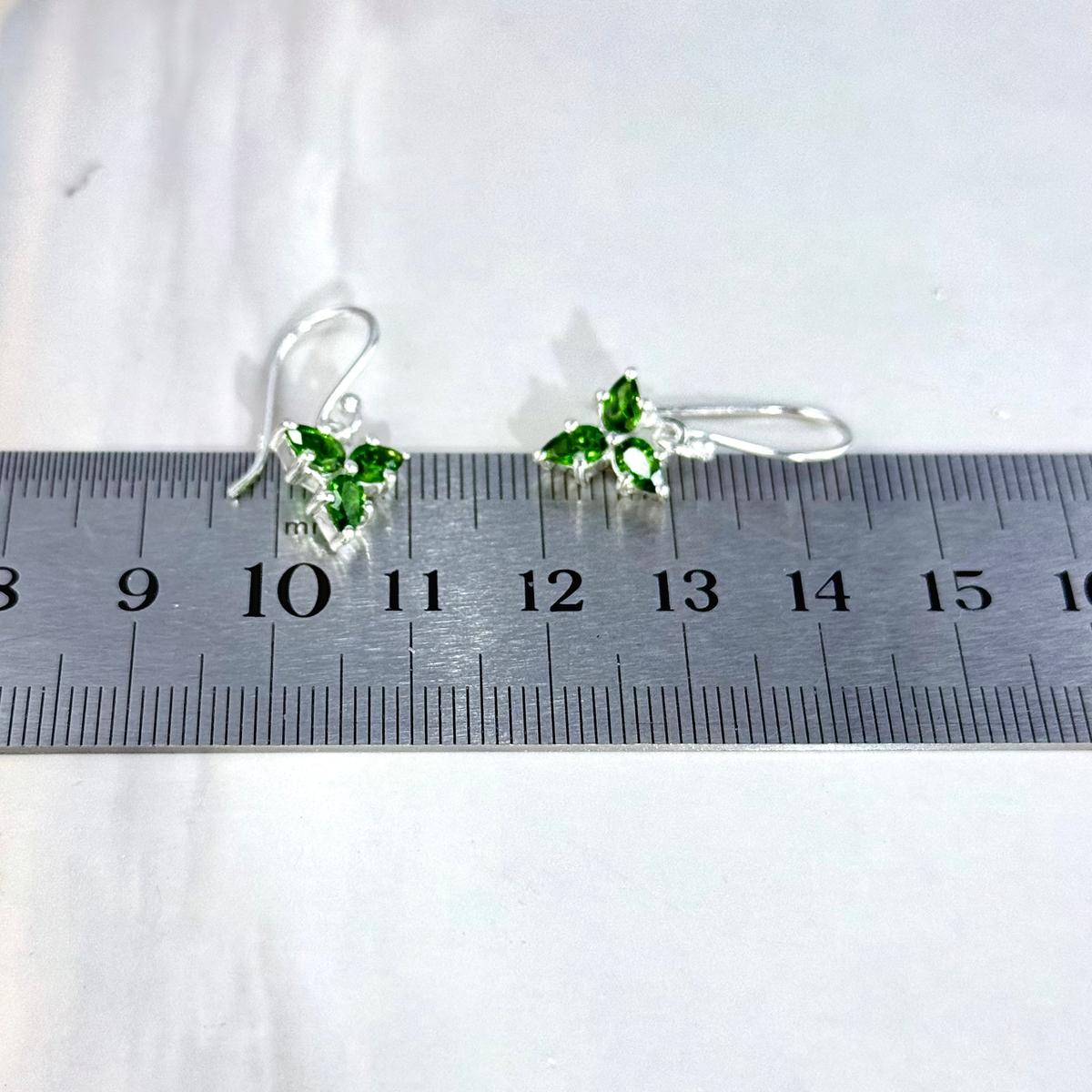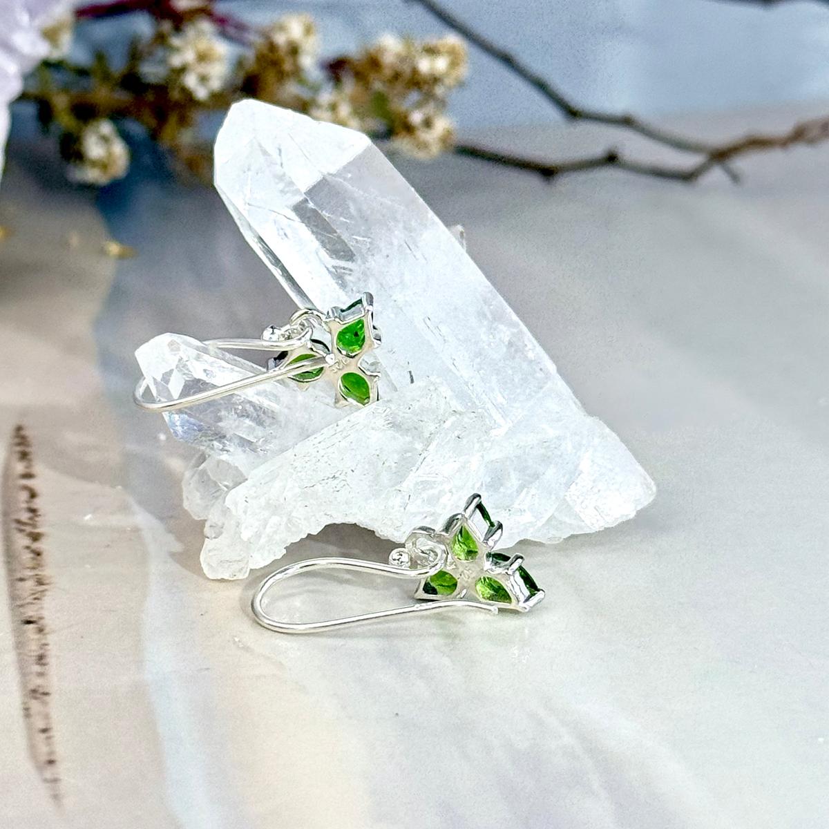 Gorgeous, delicate Chrome Diopside gemstone flower drop earrings, created from three teardrop cut gemstones which are claw set in a Sterling Silver setting and hook earring fastening.