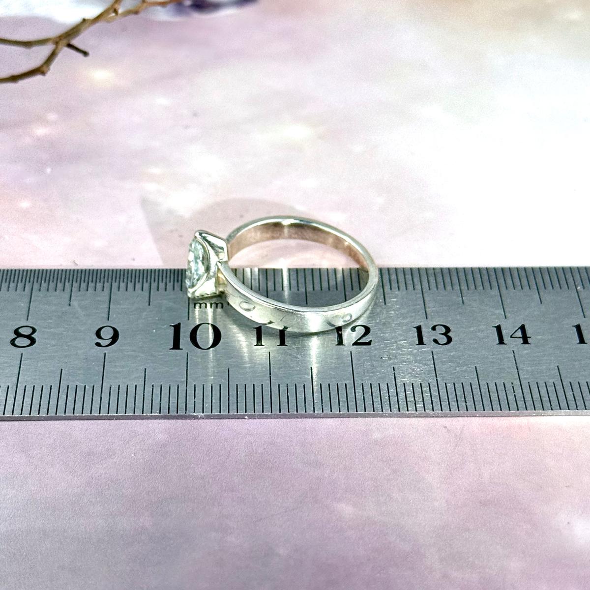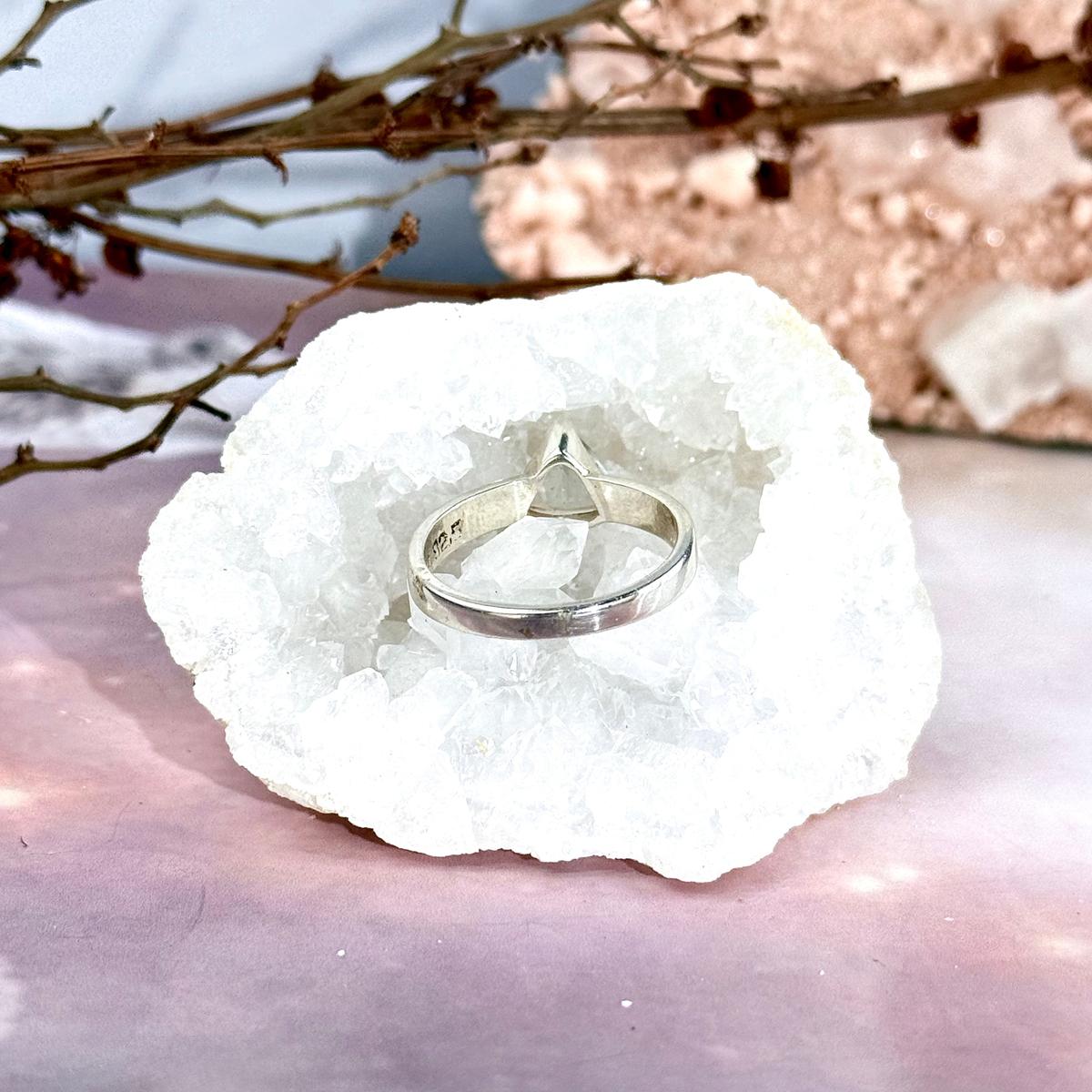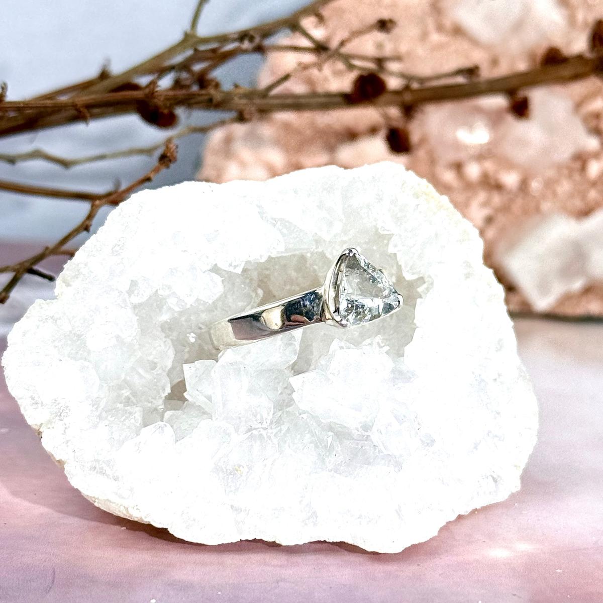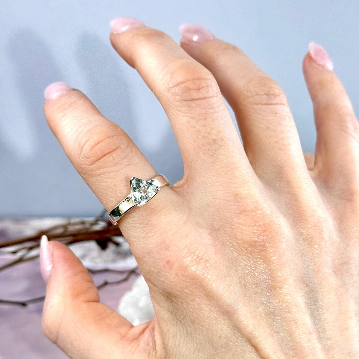 Stunning, icy blue, trillion cut Aquamarine gemstone, claw set in a medium width Sterling Silver ring band. Size 8/Q