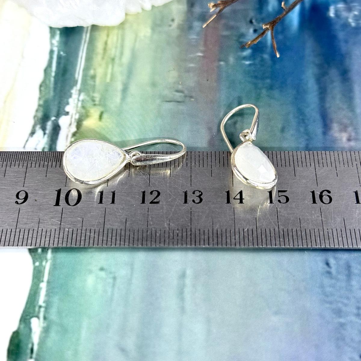 Stunning blue/purple colour flashes in these pear shaped, checkerboard faceted, Rainbow Moonstone crystals, bezel set in a Sterling Silver drop earring design.