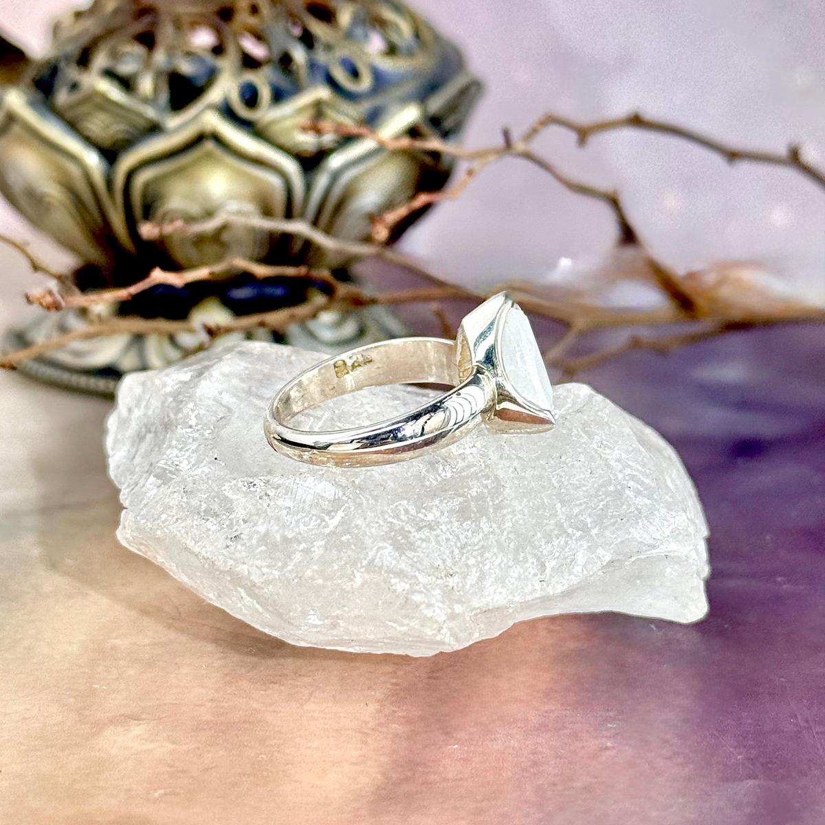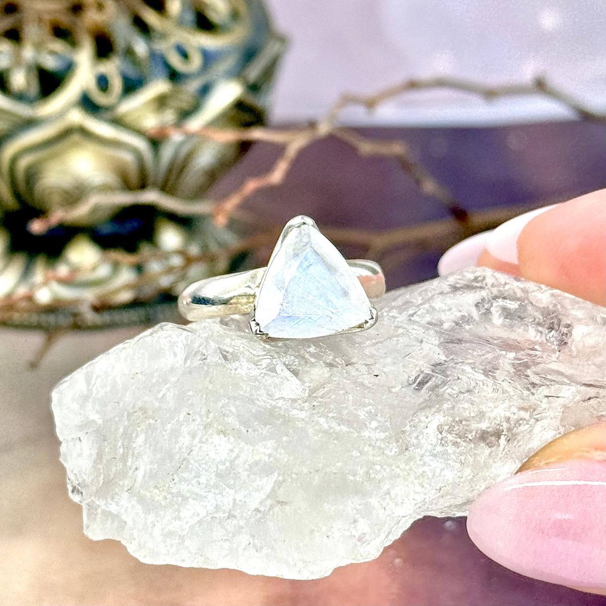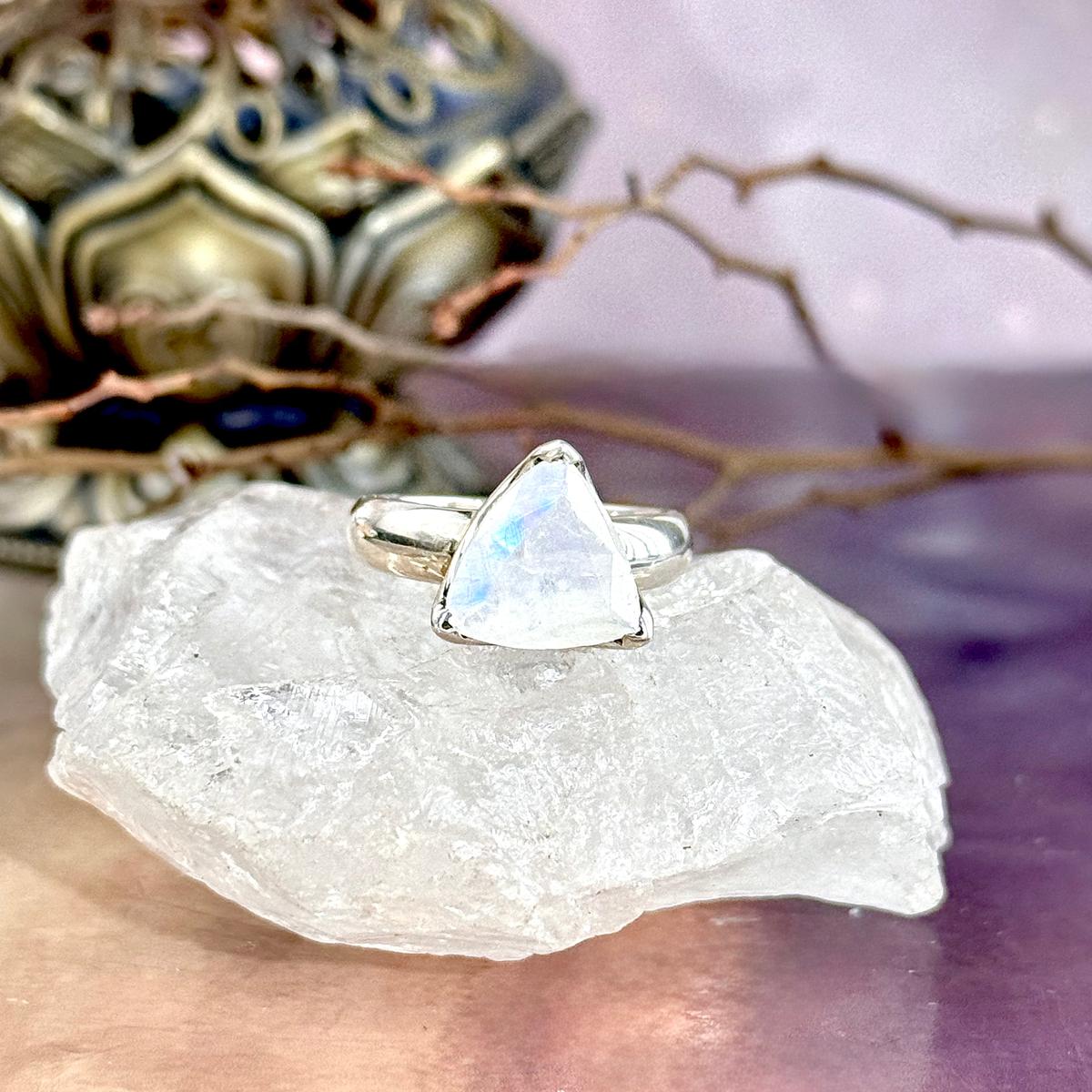 Beautiful, strong flashes of blue and purple rainbows, in these trillion cut, Rainbow Moonstone crystals, claw set in Sterling Silver ring bands. Two sizes available.