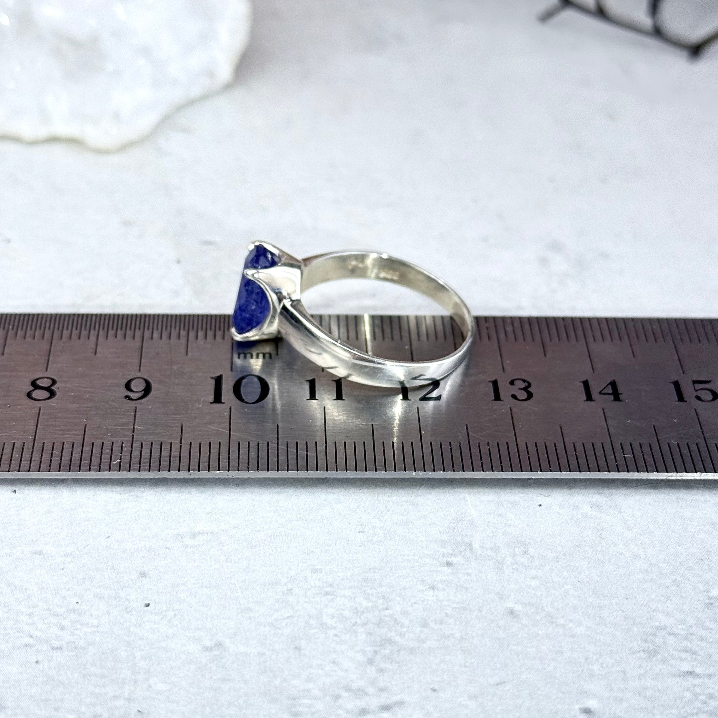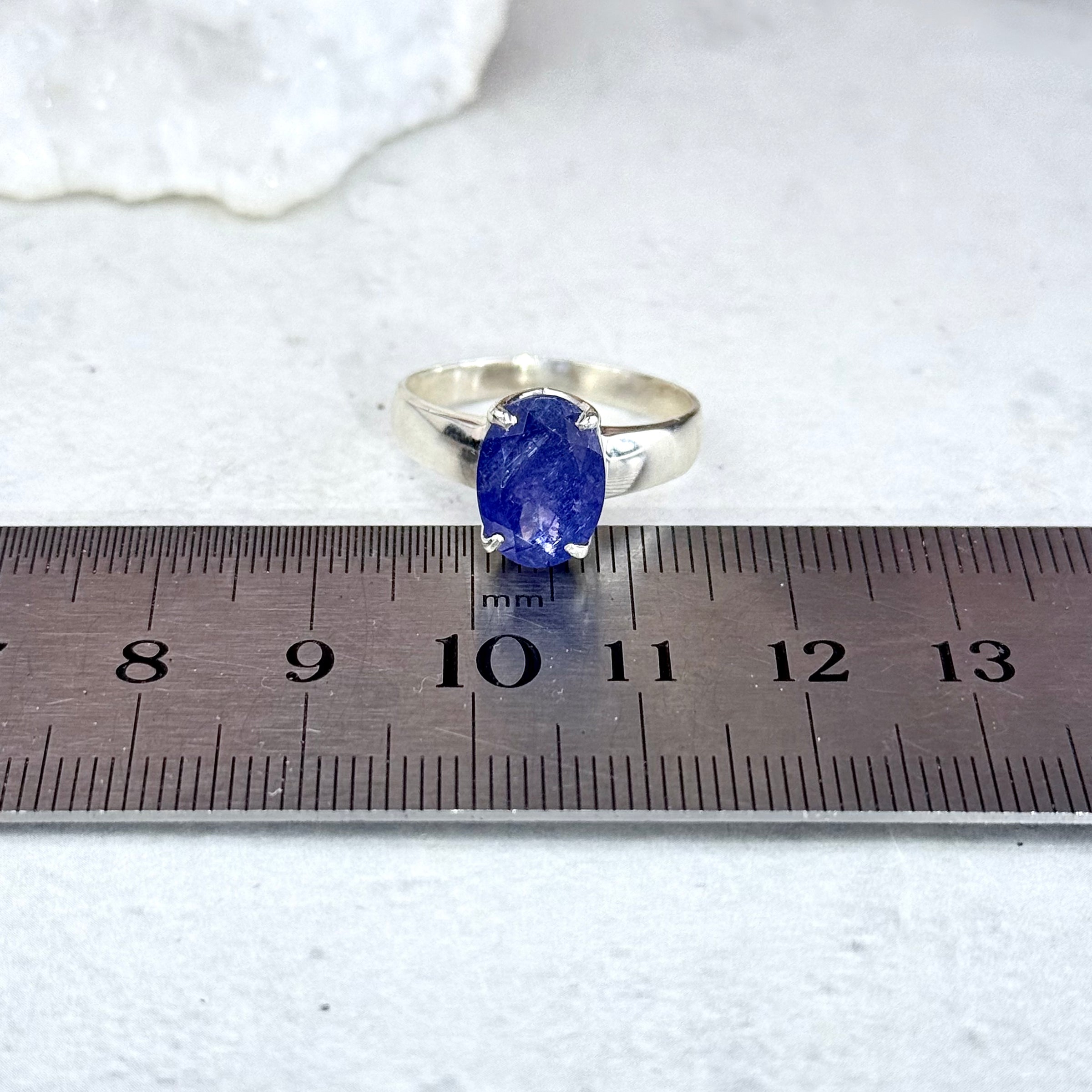 Beautiful blue colour in this oval cut, high grade Tanzanite gemstone, claw set in a Sterling Silver ring band. Size 9/S