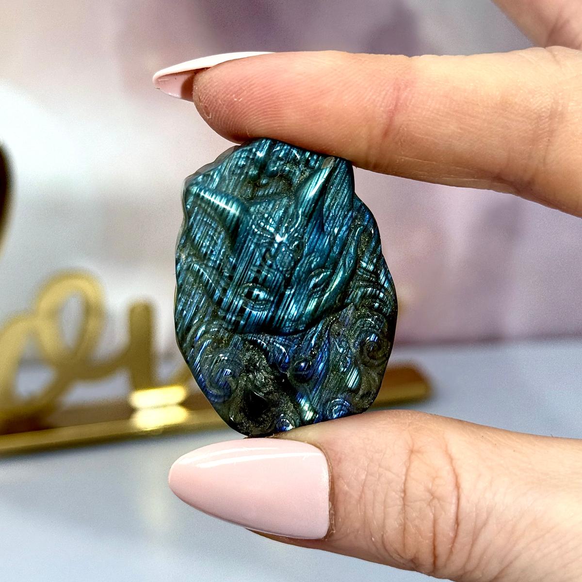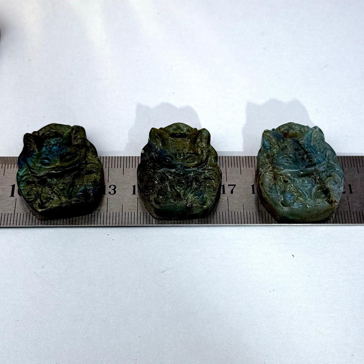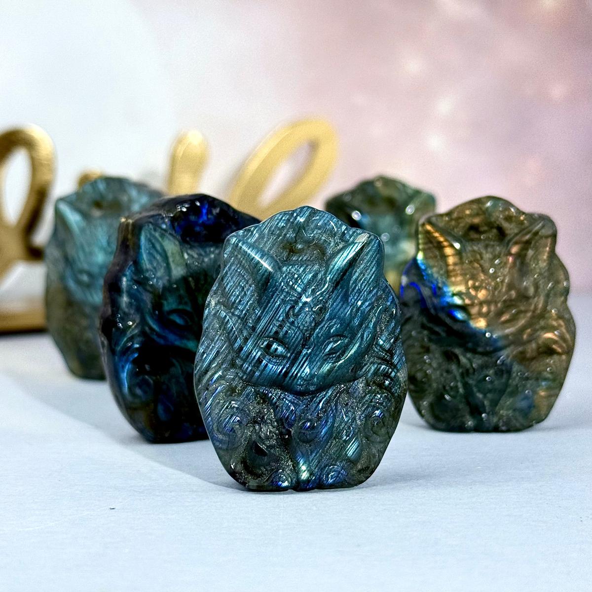 Beautifully detailed, hand carved Labradorite stones, each featuring a fox motif, and a hole at the top, which allows for them to be turned into pendants if so desired.