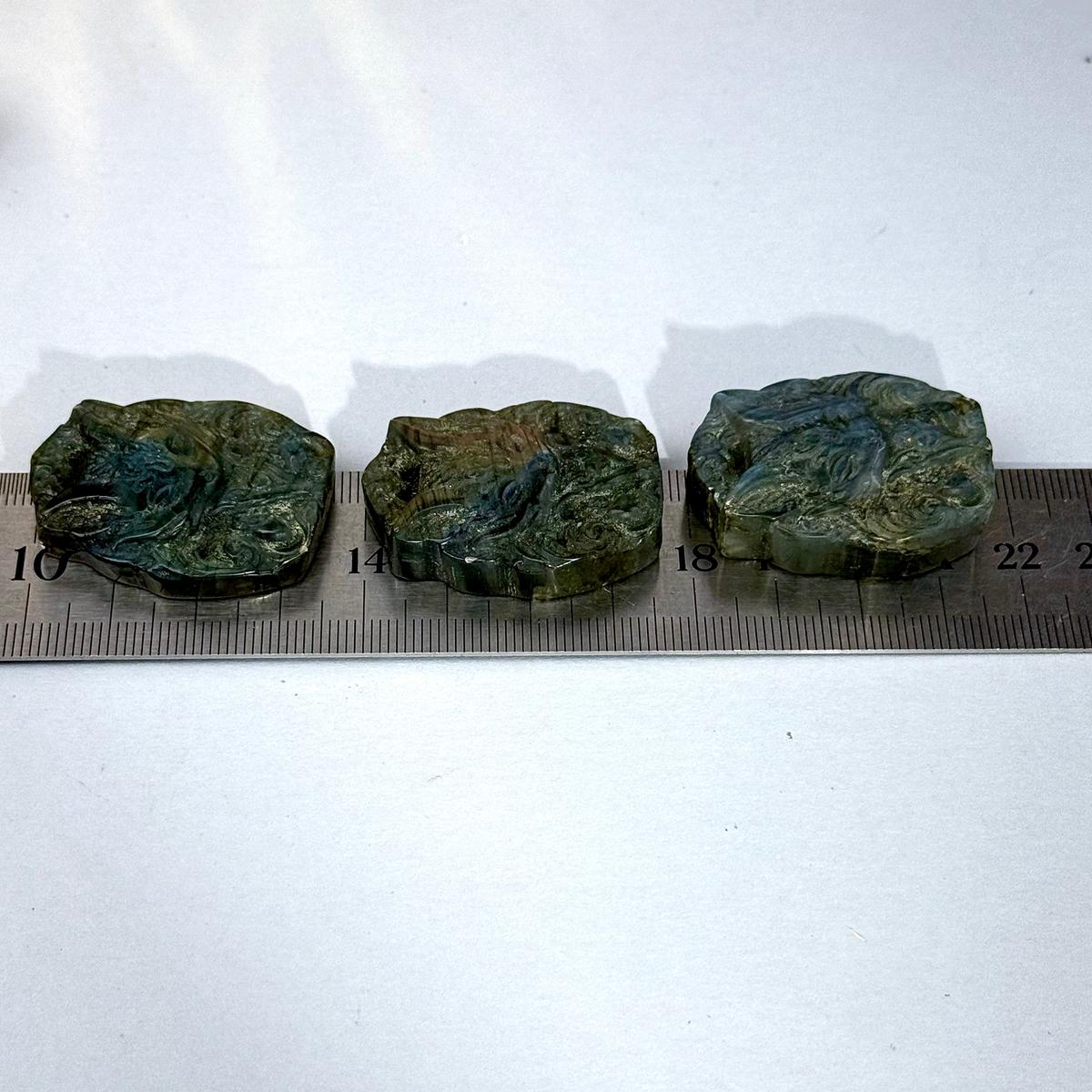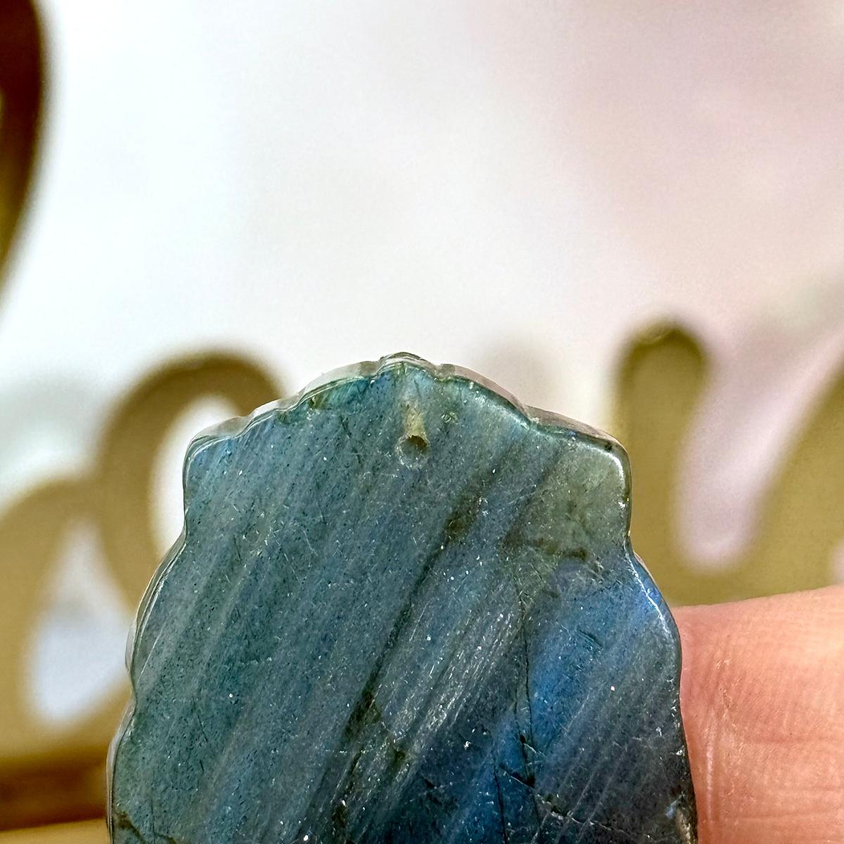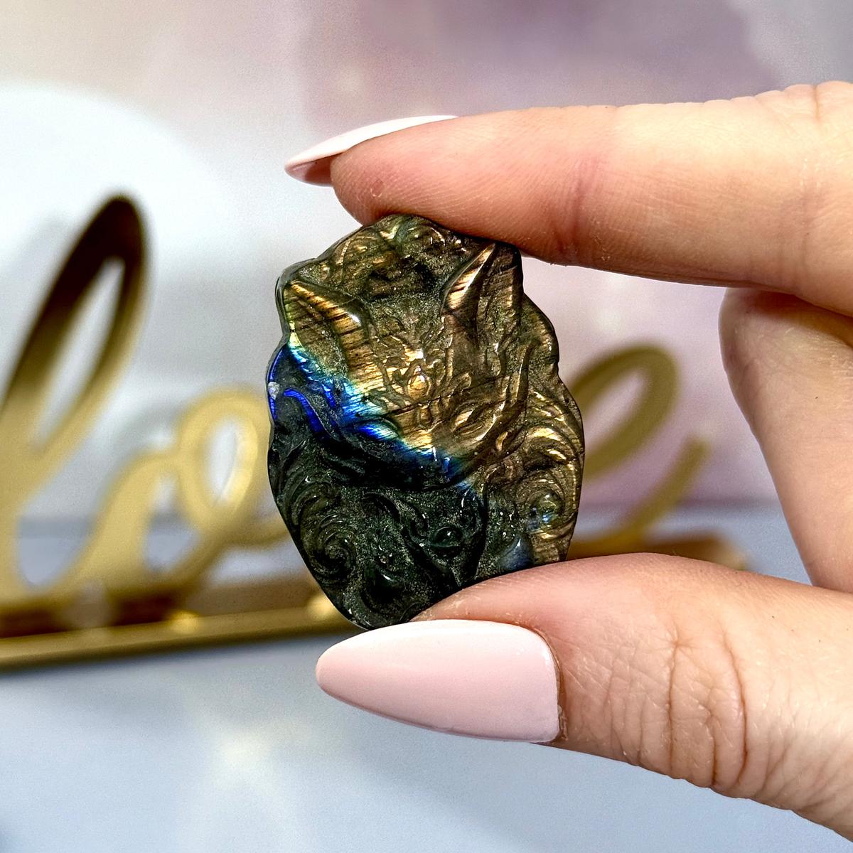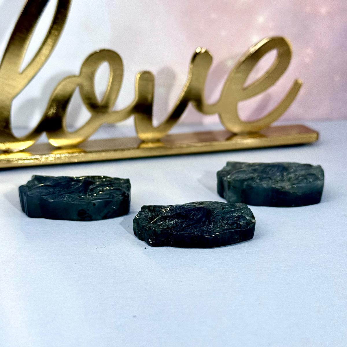 Beautifully detailed, hand carved Labradorite stones, each featuring a fox motif, and a hole at the top, which allows for them to be turned into pendants if so desired.