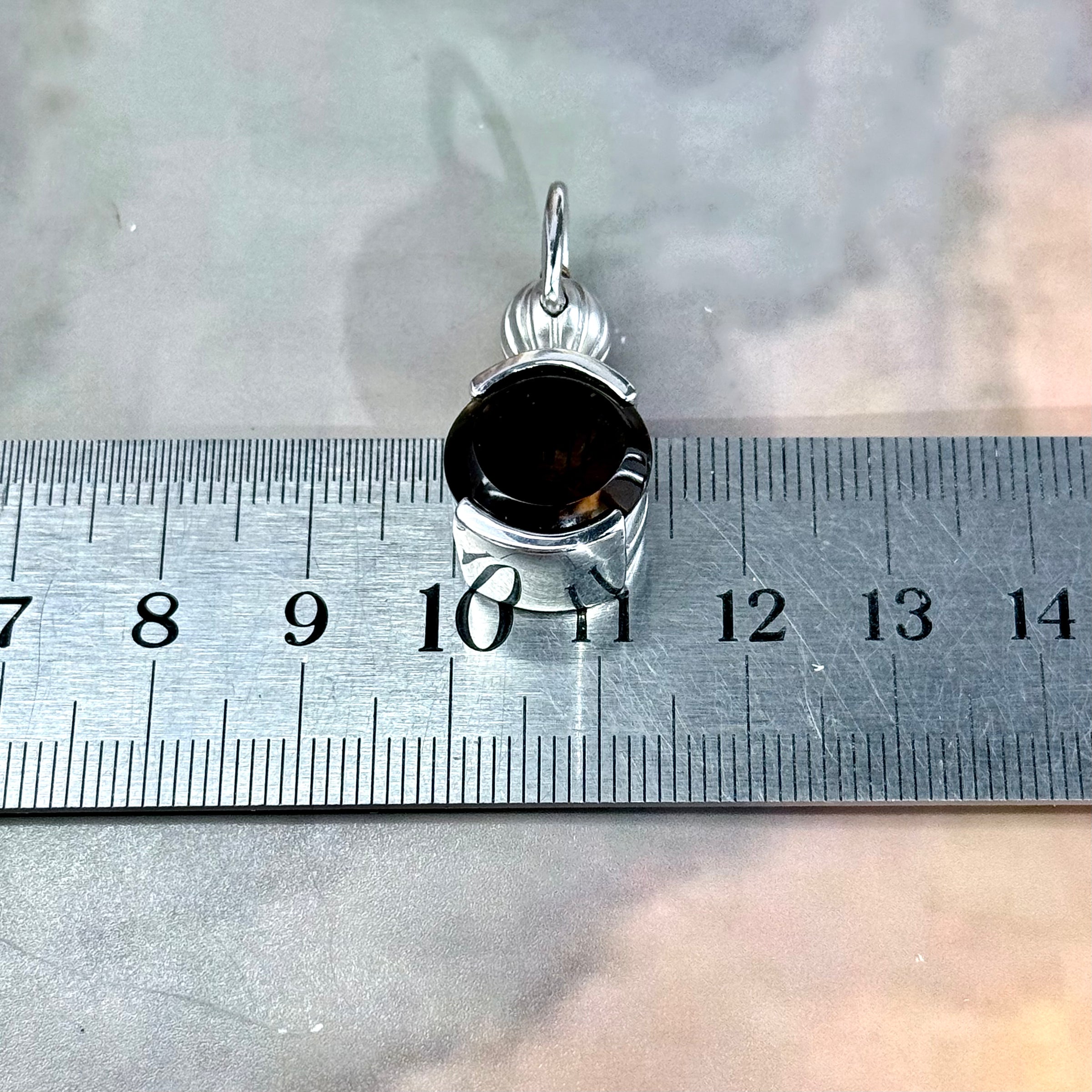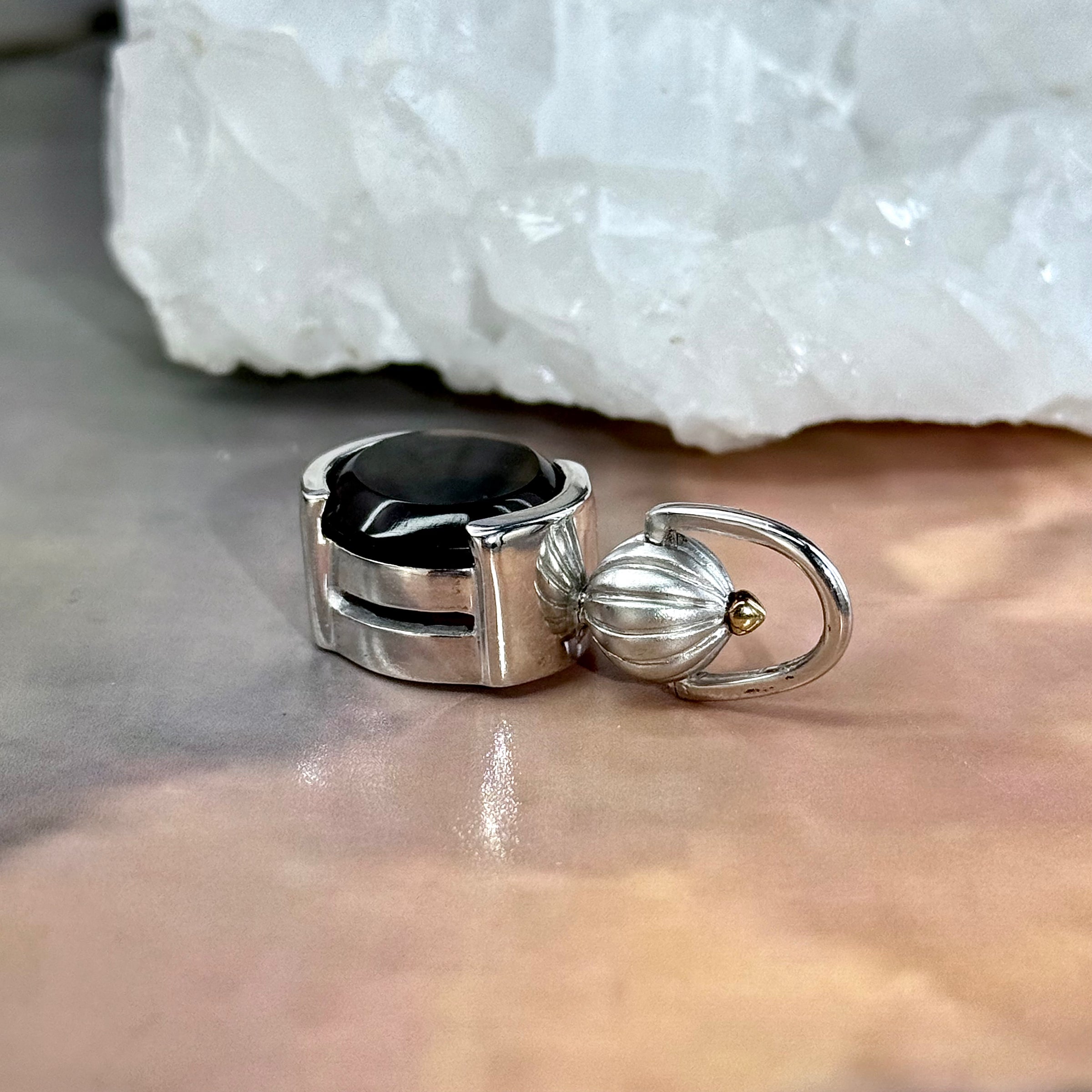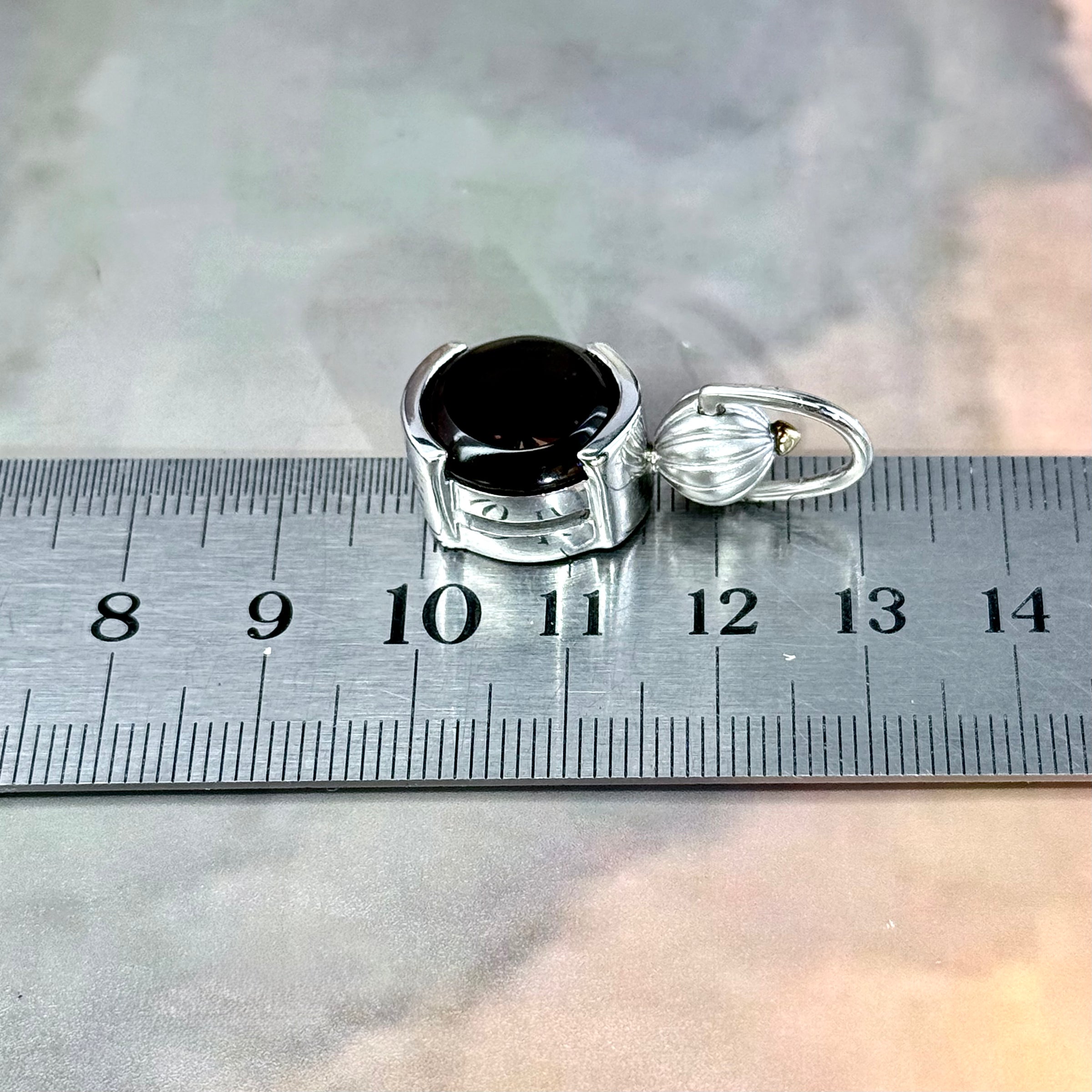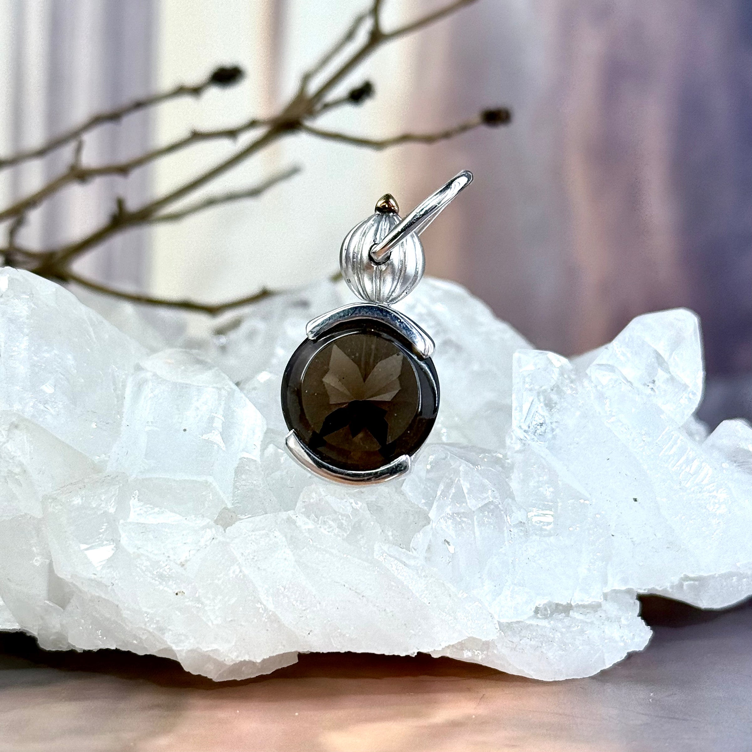A gorgeous, highly detailed, one of a kind pendant, featuring a round cut Smokey Quartz gemstone, with a laser carved butterfly motif at the centre. Set in a Sterling Silver gallery with detailed twist knob joint, and a 24ct Gold Plated top. This piece was designed and handcrafted in the Studio of Master Jeweller Janusz Szkutnik.