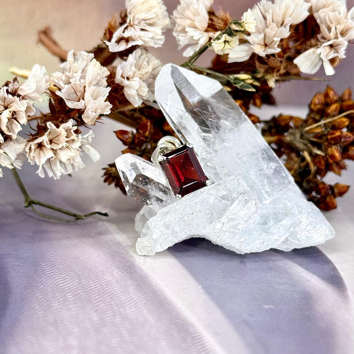 Beautiful, delicate, emerald cut Garnet gemstone, claw set in a Sterling Silver pendant design. Chain sold separately.